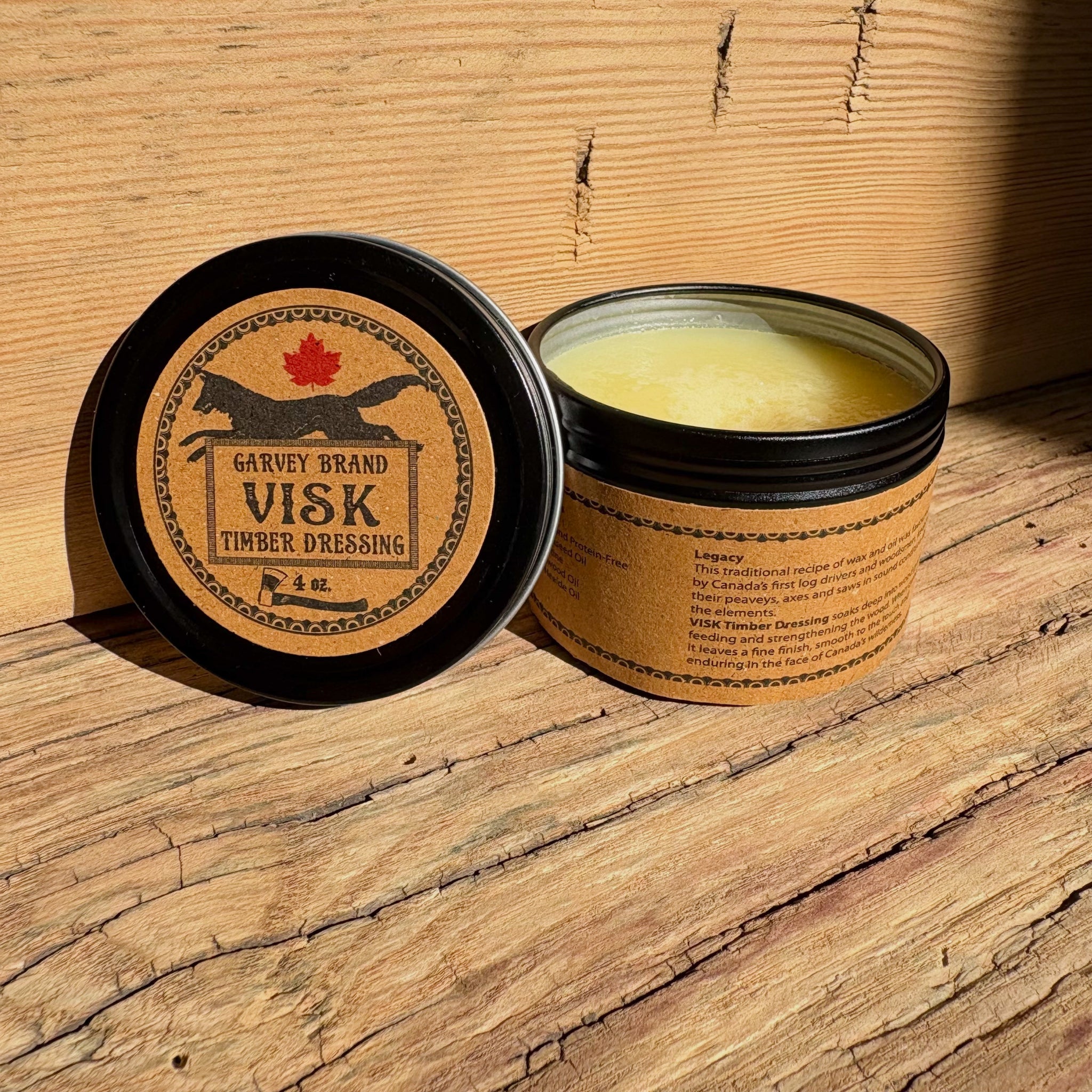 This traditional recipe of wax and oil was favoured by Canada’s first log drivers and woodsmen, keeping their peaveys, axes and saws in sound condition against the elements. VISK Timber Dressing soaks deep into wood grain, feeding and strengthening the wood. When cured, it leaves a fine finish, smooth to the touch and enduring in the face of Canada’s wilderness.