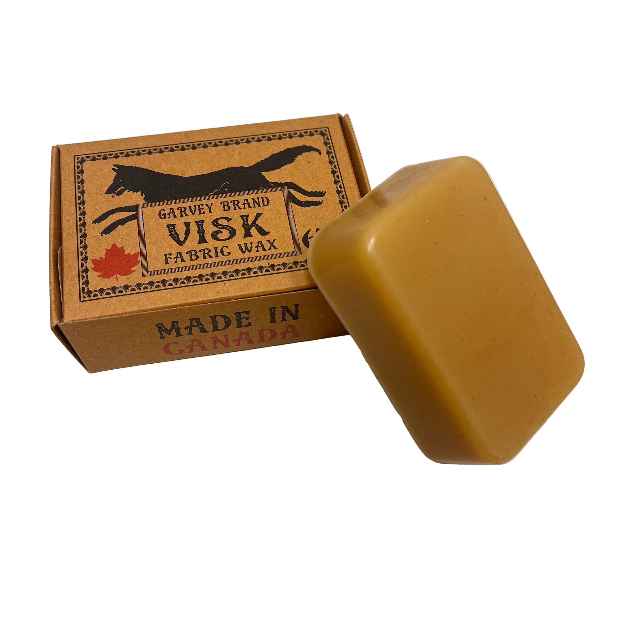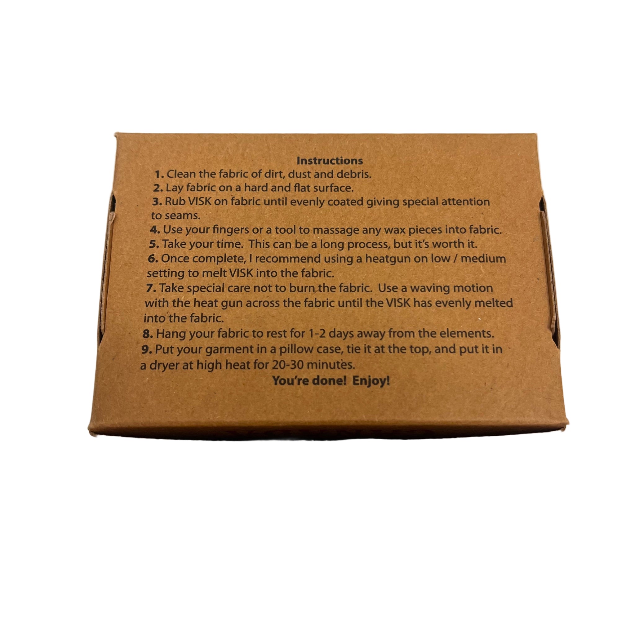 Visk Fabric Wax provides superior water proofing for canvas packs, bags, jackets, hats etc. with a proprietary mix of wax, oils and resin. To apply, simply rub the Visk bar onto fabrics until shiny and stiff, then heat gently with a blow dryer or heat gun to allow fabric to absorb.